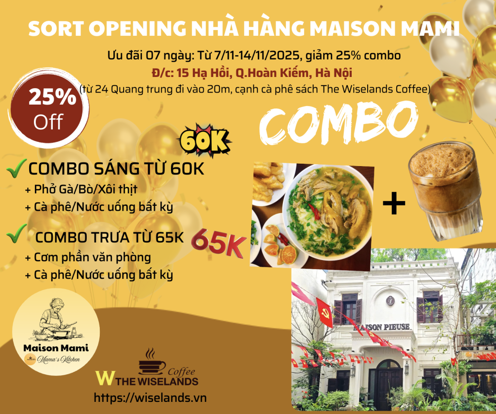 Khai trương: 7/11/2025, ưu đãi giảm 25% combo nước+ đồ ăn.