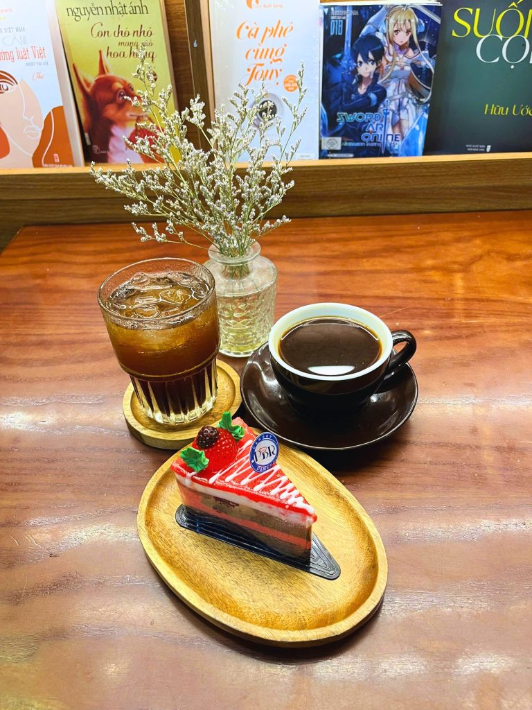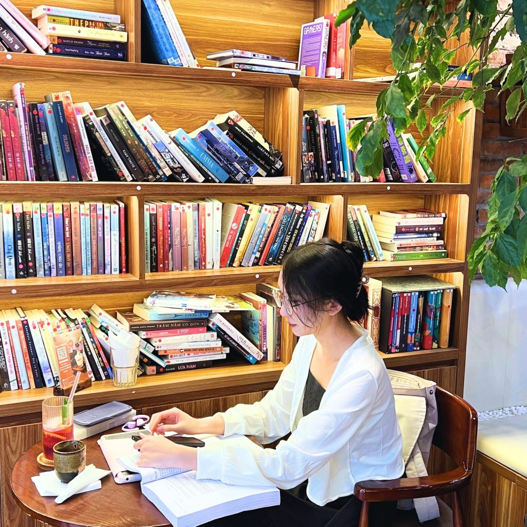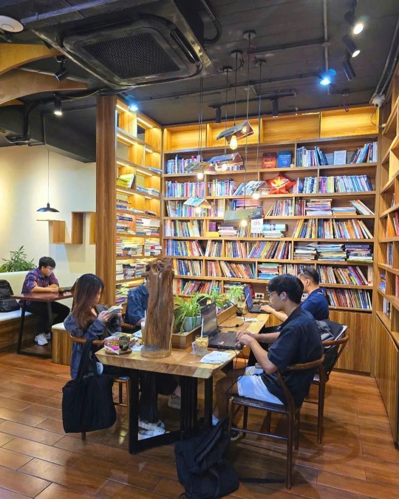 Những tủ sách khổng lồ bao bọc không gian quán, lặng lẽ nhưng đầy gợi mở, chứa đựng các đầu sách và tài liệu chuyên sâu dành cho những ai yêu việc đọc, suy nghĩ và học hỏi.