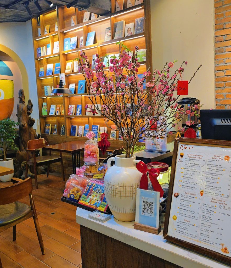 Không chỉ là nơi thưởng thức đồ uống, quán cà phê đẹp The Wiselands Coffee còn mang đến không khí xuân rõ nét với hoa đào nở rộ, câu đối đỏ treo cao, sắc vàng của hoa cúc và những chậu quất trĩu quả.