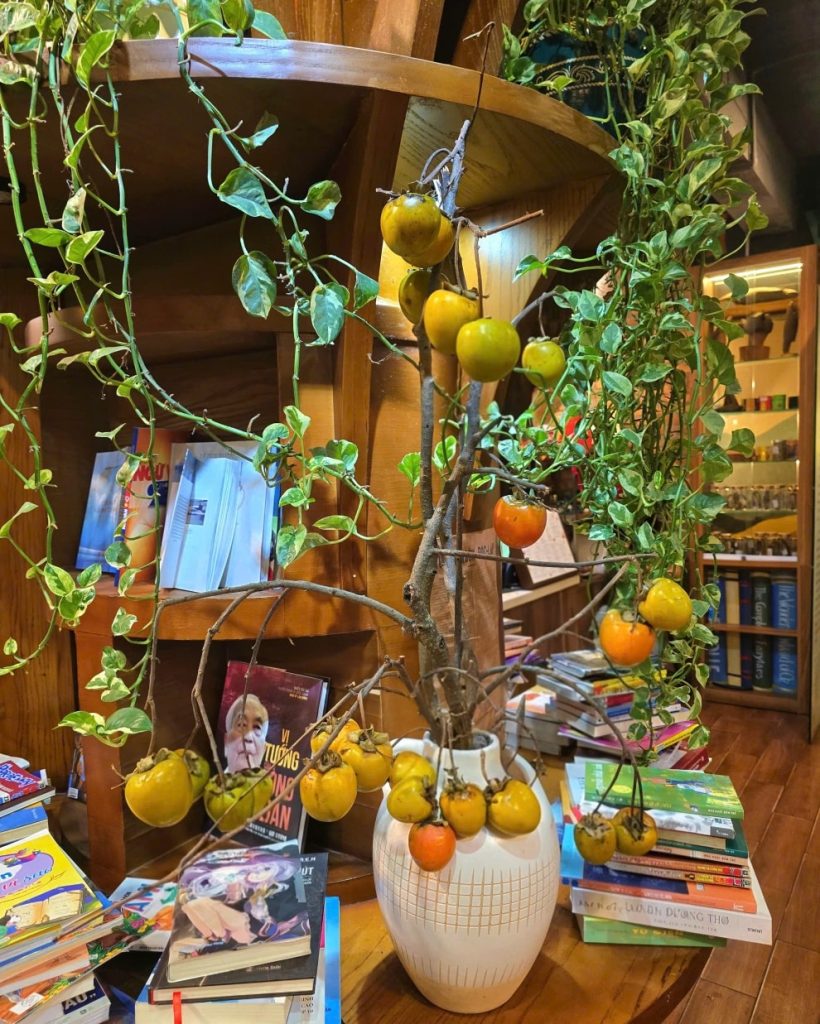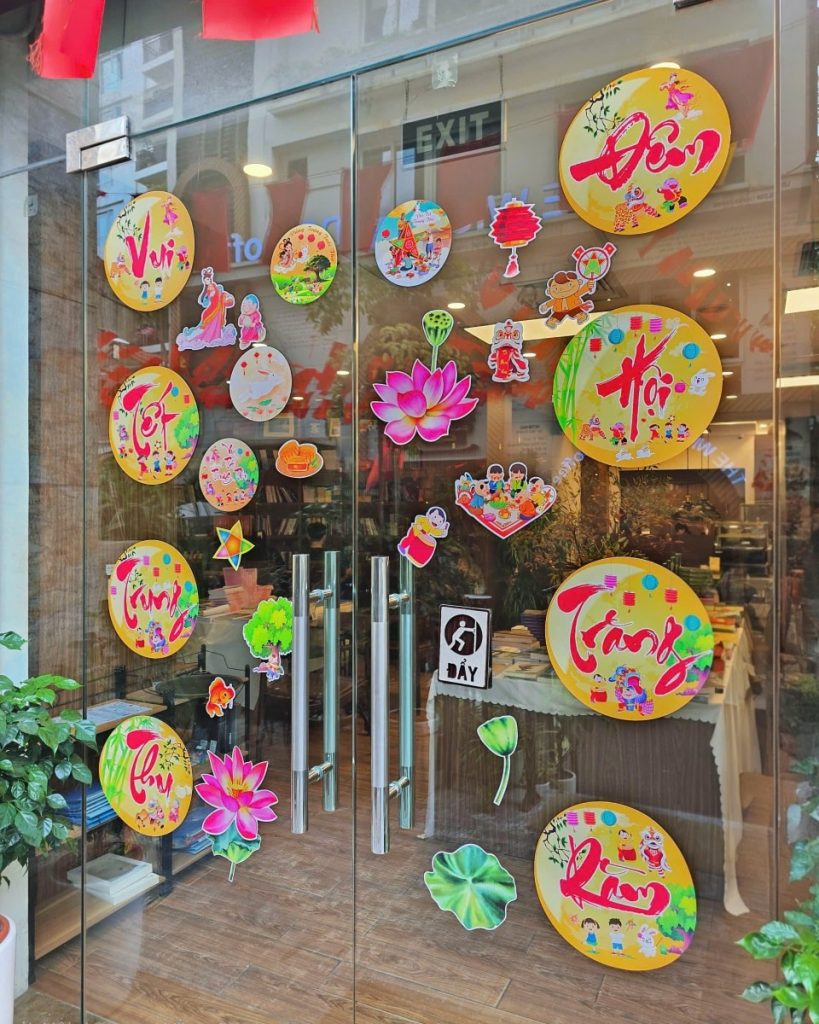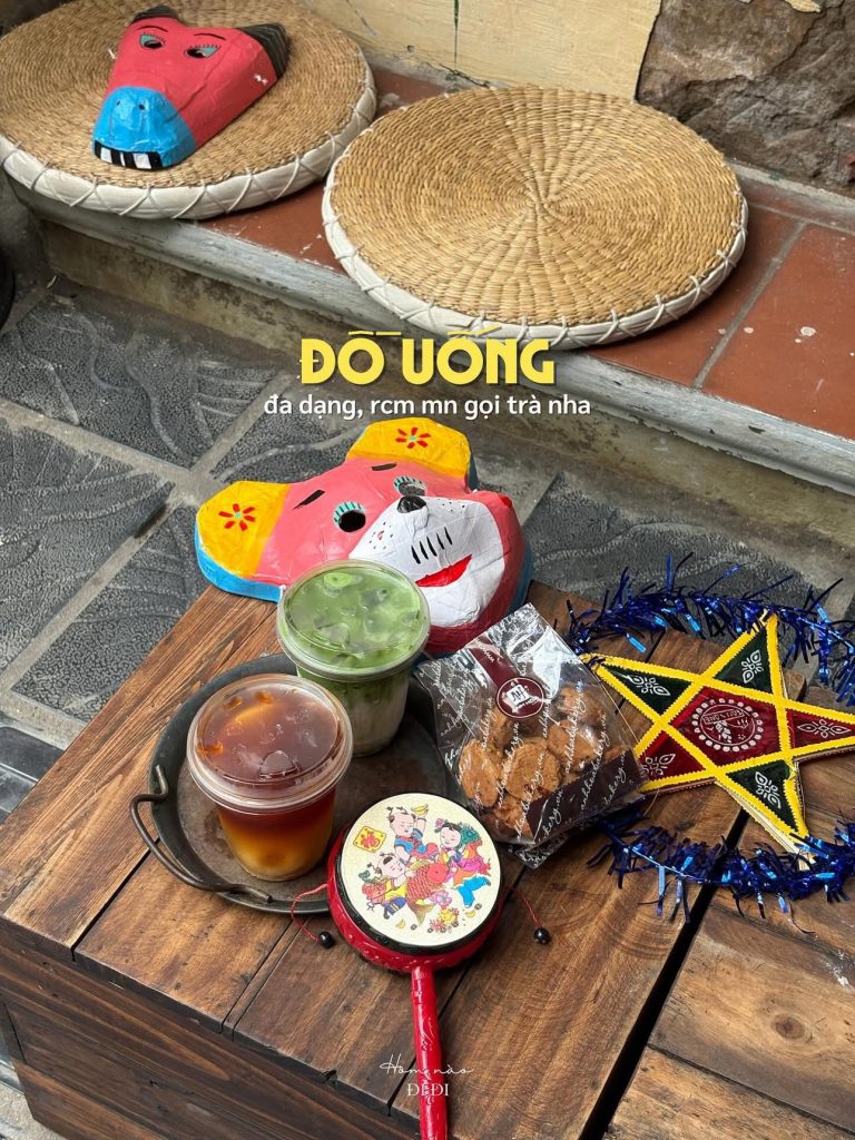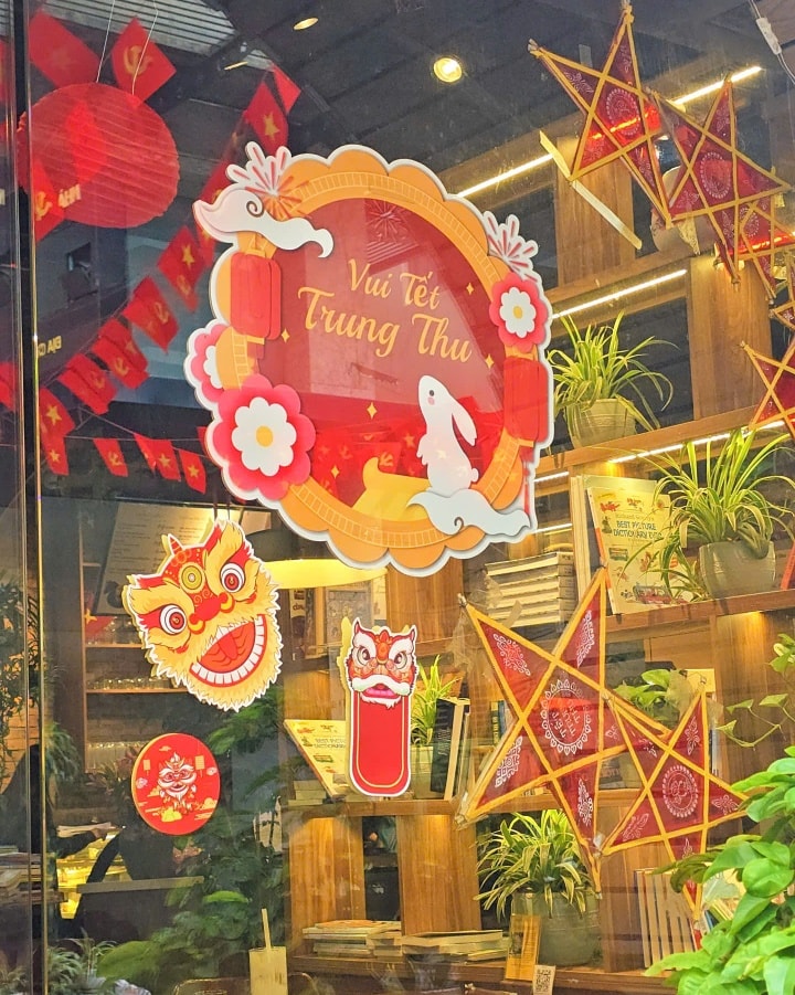 Bước vào quán, bạn sẽ ngay lập tức cảm nhận được không khí lễ hội tràn ngập với những chiếc đèn ông sao, lồng đèn nhiều đỏ rực, cùng cây hồng trĩu quả mang hơi thở mùa thu Bắc bộ. Trên tường, những hình dán Trung Thu ngộ nghĩnh như chú Cuội, chị Hằng hay đoàn múa lân càng khiến không gian trở nên gần gũi và sống động.