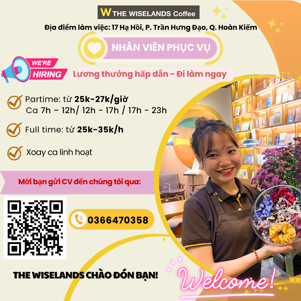 The Wiselands Coffee tuyển dụng nhân viên phục vụ làm việc tại mô hình cà phê sách độc đáo ngay trung tâm quận Hoàn Kiếm.